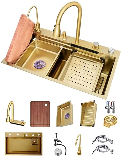 ZQFHSX Évier de Cuisine Gold Nano en Acier Inoxydable 304, Style Cascade, Multifonction, à Une cuve, avec Robinet et bonde, pour Bar ou Camping-Car. Décoration intérieure (Couleur : Or-b,