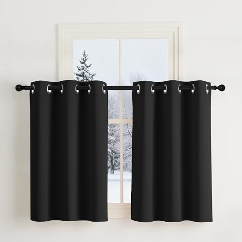 NICETOWN Rideauxs Fenetre Thermique Occultant Court, Petit Draperies à Oeillets Lumineux Bloquer Decoration pour Cuisine Chambre, Largeur 107 x Hauteur 90 cm, Noir, 2 Pièces