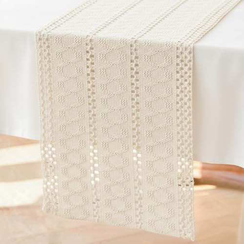 Chemin de Table Macrame Beige Blanc Boho Centre de Table Decoration en Coton Lin Tissu Boheme Mariage Ferme Moderne Lavable Nappe Décor pour Champetre Salle à Manger Anniversaire 30 x 183 cm