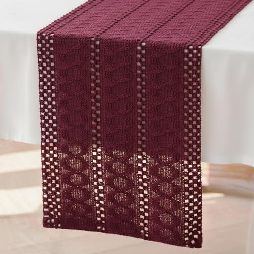 Macrame Chemin de Table Bordeaux Boho 30 x 140 cm Centre de Table Decoration en Coton Lin Tissu Boheme Mariage Ferme Moderne Lavable Nappe Décor pour Champetre Cuisine Vacances Anniversaire Fête