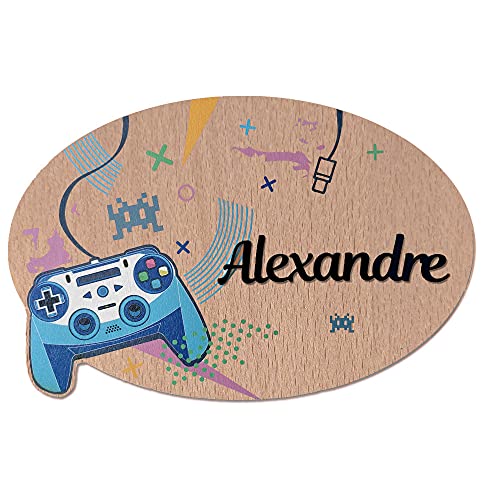 Plaque de Porte Gamer Personnalisée. Plaque Chambre Enfant. Plaque Bois Personnalisable avec Prénom. Décoration Chambre Enfant Jeux Vidéo - 2 perçages en Haut, Plexi Noir