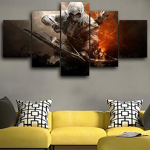 YUANJUN 5 Pieces Toile Tableau Tableaux Deco Murale Salon Moderne Imprimé Toile Intissee Decoration Photo Image Artistique Photographie Peintures De Jeux Vidéo Assassin's Creed Connor