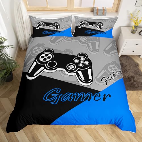 Jeux pour garçons Housse de Couette Jeux vidéo pour Adolescents literie Gaming pour Enfants Parure de Lit 200x200 Jeux Literie de jeu Ensemble de décoration Gamer 3 taies d'oreiller Bleu Noir Gris