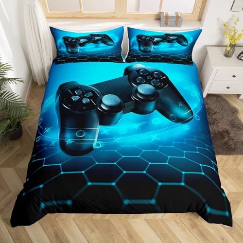 Housse de Couette Jeux Vidéo 220x240 pour Adolescents,Ensemble de Literie Gamer pour Enfants Garçons,Housse Couette Gaming Parure de Lit Gamepad Bleu Noir Nid D'Abeille Décoration de Chambre 3 Pièces