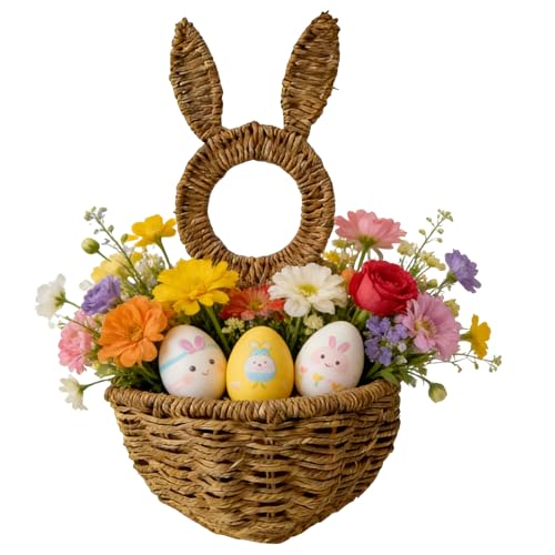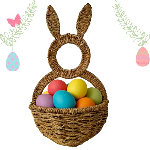 Panier mural en forme de lapin de Pâques – Décoration murale en osier tissé à la main | Organiseur rustique en paille pour maison, ferme, porte d'entrée, salon, balcon à suspendre