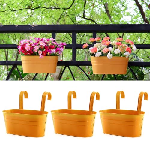 Meltset Lot de 3 pots de fleurs ovales en fer à suspendre pour clôture, jardin, balcon, décoration murale, intérieur et extérieur, orange