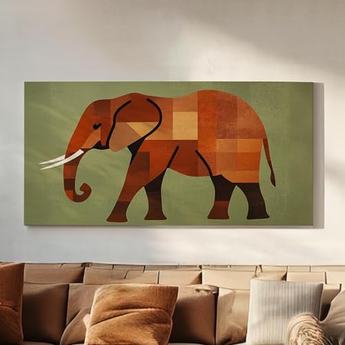 lianyibo Tableau éléphant d'Afrique sur toile | Impression cubiste géométrique | Décoration murale bohème pour salon | Vert sauge terracotta (50 x 100 cm/Sans cadre)
