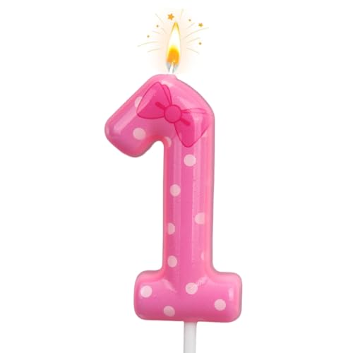 SAVITA Bougie d'Anniversaire avec Nœud Rose, Pois Blancs Bougie Numérotée avec Nœud Rose Décoration de Gâteau d'Anniversaire Décoration de Gâteau pour Fête Anniversaire (Numéro 1)
