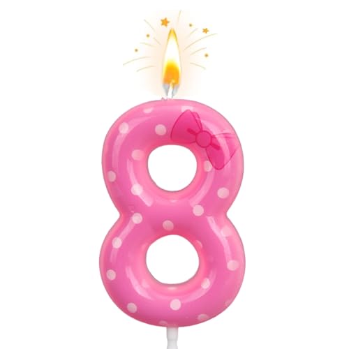 SAVITA Bougie d'Anniversaire avec Nœud Rose, Pois Blancs Bougie Numérotée avec Nœud Rose Décoration de Gâteau d'Anniversaire Décoration de Gâteau pour Fête Anniversaire (Numéro 8)