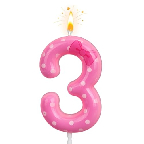 SAVITA Bougie d'Anniversaire avec Nœud Rose, Pois Blancs Bougie Numérotée avec Nœud Rose Décoration de Gâteau d'Anniversaire Décoration de Gâteau pour Fête Anniversaire (Numéro 3)