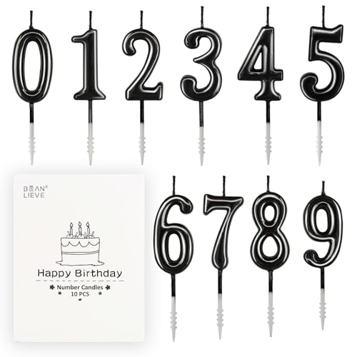 BEAN LIEVE Lot de 10 bougies d'anniversaire à chiffres - Bougies à chiffres de 0 à 9 à paillettes pour décoration de gâteau, anniversaire de mariage et fête (Noir)