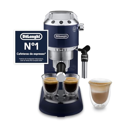 De’Longhi Dedica Style - Perfetto Machine à Expresso Compacte, Mousseur de Lait Manuel pour Expresso et Cappuccino, Compatible Dosettes ESE,Panneau de Commande à Boutons, Largeur 15cm, Bleue(EC685.BL)