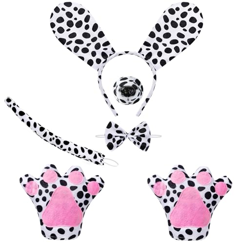 5 Pièces Costume de Chiot Chien pour Enfant Adultes,Costume Chien Serre-tête avec Oreilles de Chien Cravate Queue Fausse Queue de Nez Déguisement Animal Accessoires Cosplay Halloween