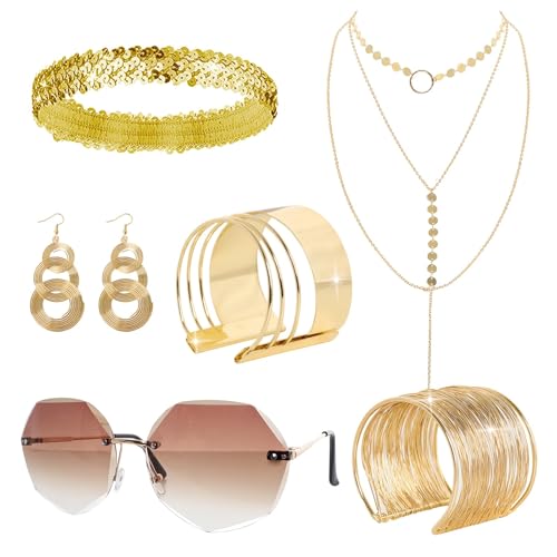 Accessoires Disco Femme, Pailletée Accessoires Deguisement Disco avec Boucles D'oreilles Collier Bracelet Lunettes pour Carnaval Fête des Années 70, 80, 90 (Or-B)