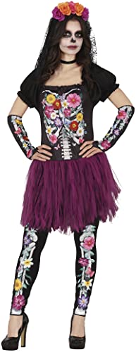 FIESTAS GUIRCA Costume Squelette avec Fleurs Jour des Morts - Comprend Robe, Manches et Leggings - Déguisement d'Halloween pour Femme Taille 42-44 L