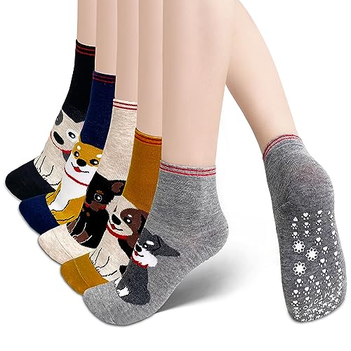 LOFIR Chaussettes Antidérapantes Femme Fantaisie: Chaussettes de Drole Animaux Femmes Chaussettes à Semelle Antidérapante Coton Sport Socquettes avec Motif Chien pour Femmes 5 Paires Taille 35-41