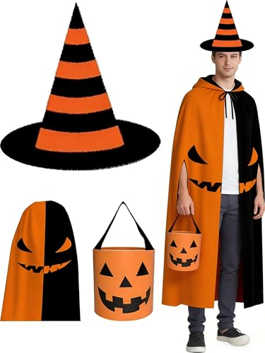 MOMAHUA 3 Pièces Déguisement de Sorcier Halloween pour Garçon 6-15 Ans,Cape, Chapeau et Sac à Bonbons Citrouille,Costume Fête Déguisée, Accessoire Cosplay et Maquillage Kids