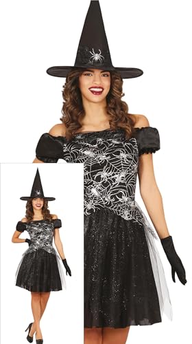 FIESTAS GUIRCA Déguisement de sorcière araignée pailletée pour femme, Comprend un chapeau de sorcière et une robe de sorcière noire avec motif toile d'araignée, Costume d'Halloween pour femme taille S