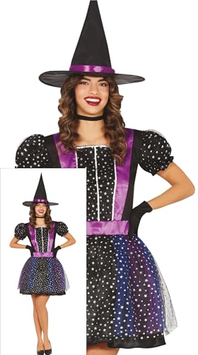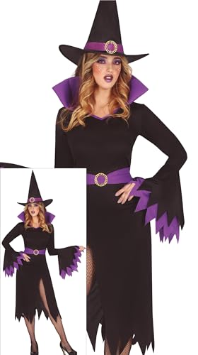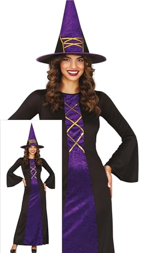 FIESTAS GUIRCA Déguisement de sorcière mystique pour femme, Comprend un chapeau de sorcière violet et noir, une robe avec fente pour les jambes et une ceinture, Costume d'Halloween pour femme taille M
