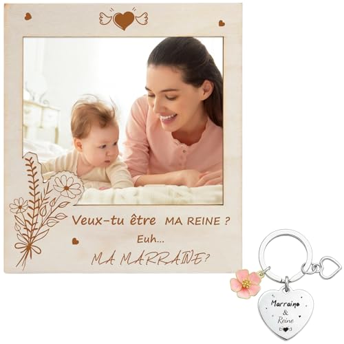 TCRZHHRX Demande Originale de Marraine, Cadre Photo en Bois pour Cadeau Marraine Demande, Veux-tu être ma marraine? et Porte-Clés MARRAINE, Cadre Magnétique pour Photo Commune (Marraine)