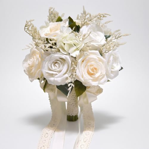 LESING Bouquets de mariée artificielles Faits à la Main – Bouquets de Mariage romantiques pour la mariée, Demoiselle d'honneur Tenant des Fleurs (Bouquet de Rose Blanc 1)