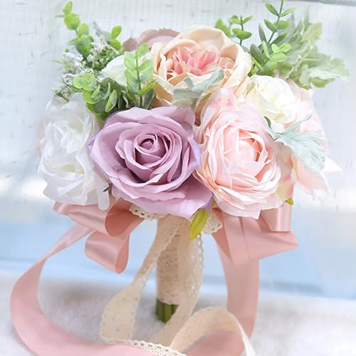LESING Bouquets de mariée artificielles Faits à la Main – Bouquets de Mariage romantiques pour mariée, Demoiselle d'honneur Tenant des Fleurs (Bouquet Rose Rose)