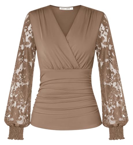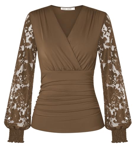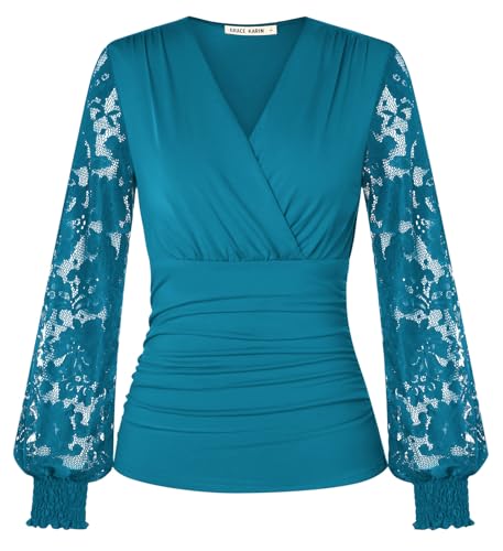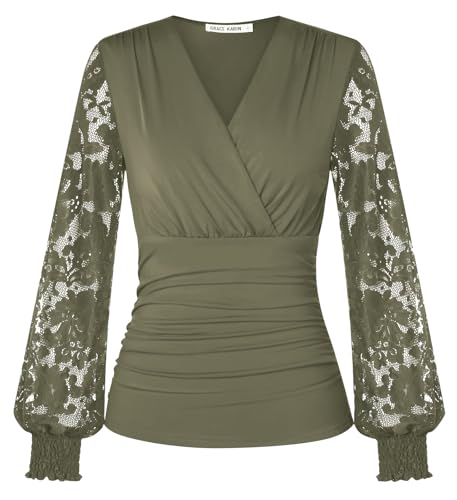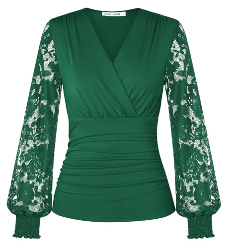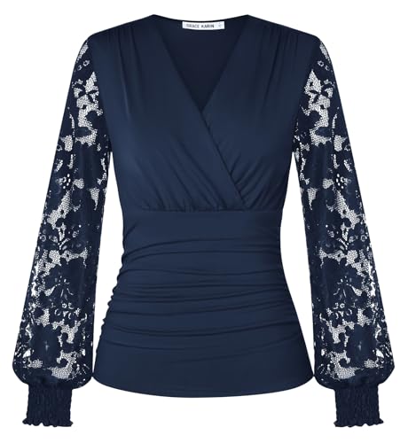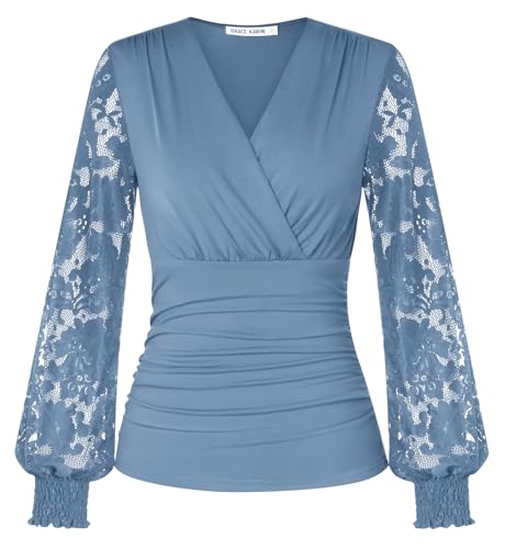 GRACE KARIN Femme Élégant Haut Dentelle Col V Croisé Sexy Blouse Portefeuille Plissé Ajusté Festif