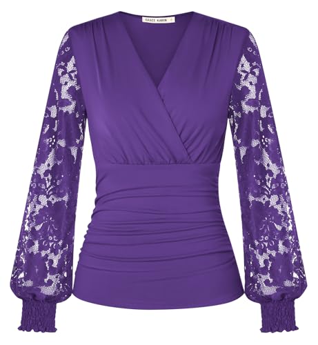 GRACE KARIN Femme Élégant Haut Dentelle Col V Croisé Sexy Blouse Portefeuille Plissé Ajusté Festif Violet L