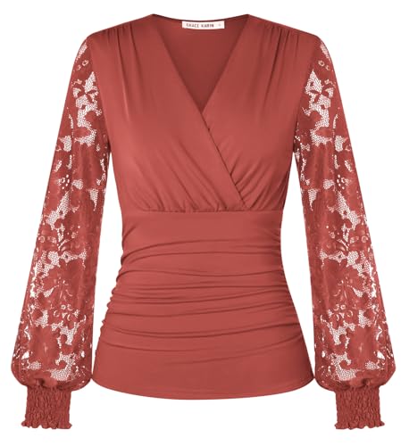 GRACE KARIN Femme Élégant Haut Dentelle Col V Croisé Sexy Blouse Portefeuille Plissé Ajusté Festif Rouge foncé L