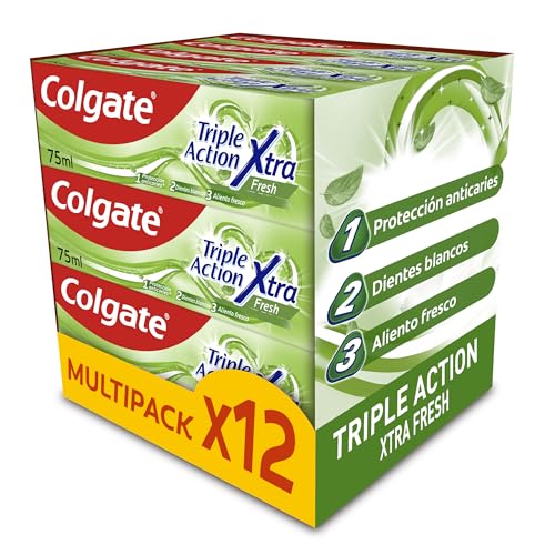 Colgate Lot de 12 dentifrices triple action Xtra Fresh 75 ml, dentifrice avec fluor, protection anti-caries, aide à garder les dents blanches, haleine fraîche, pour toute la famille