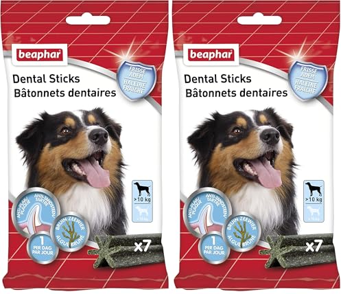 BEAPHAR - Bâtonnets dentaires pour Grands Chiens (> 10 kg) – Friandises Faibles en Calories à l'algue Brune et au thé Vert - Haleine fraîche – Éliminent la Plaque Dentaire et Le tartre – 7 unités