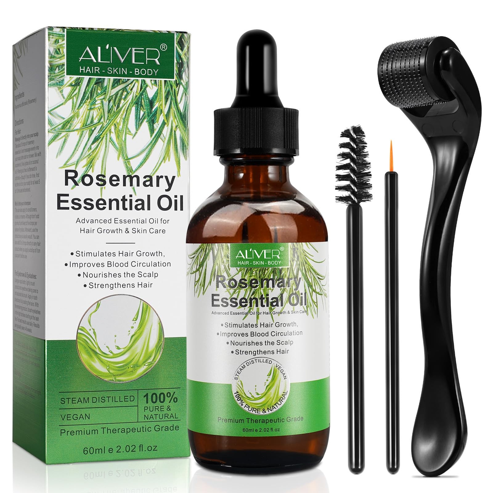 Huile de Romarin pour Cheveux 60 ml avec Derma-roller 0.25mm, 100% Pure Huile...