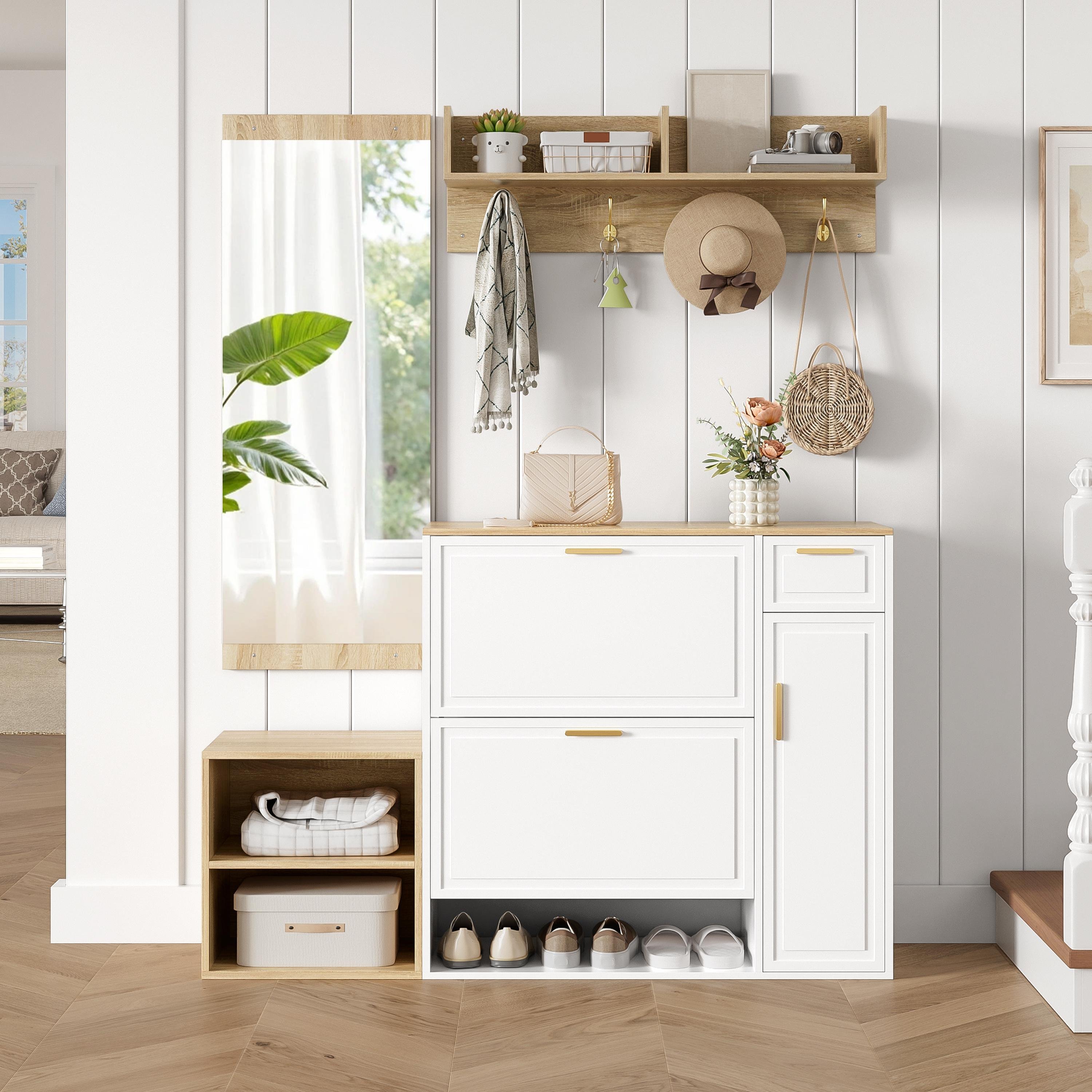 Ensemble de vestiaire Merax, ensemble complet comprenant un meuble à chaussures, un banc, un porte-manteaux mural, un miroir, une étagère, des meubles de rangement pour l'entrée, blanc + naturel
