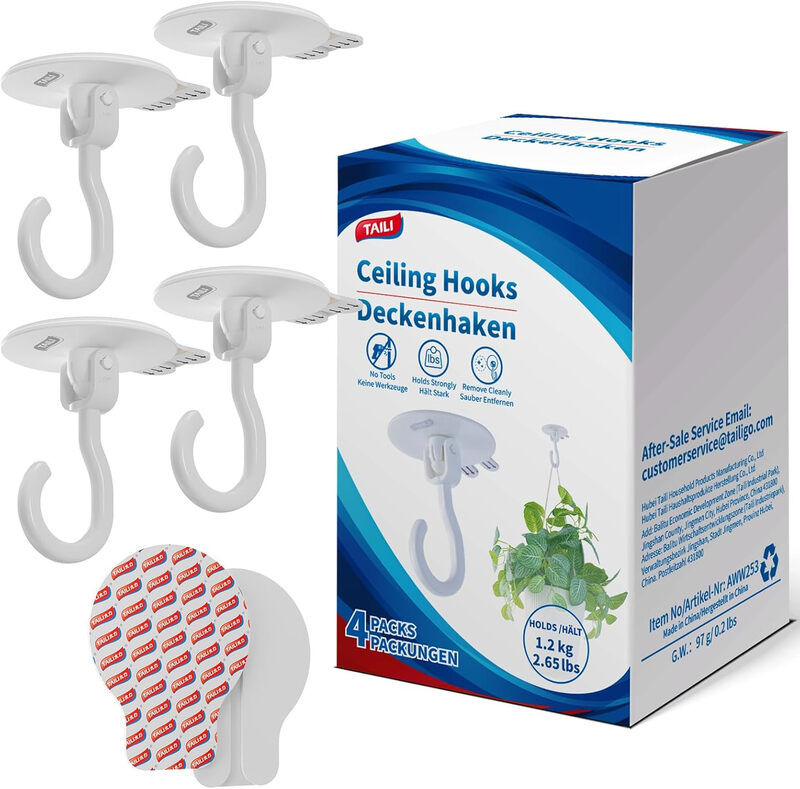 TAILI Crochets adhésifs pour plafond pour suspendre des plantes, crochets muraux adhésifs robustes sans perçage amovibles pour suspendre des guirlandes de Noël, guirlandes, manteaux pour porte, cuisine, idéal pour locataires - Lot de 4 Blanc