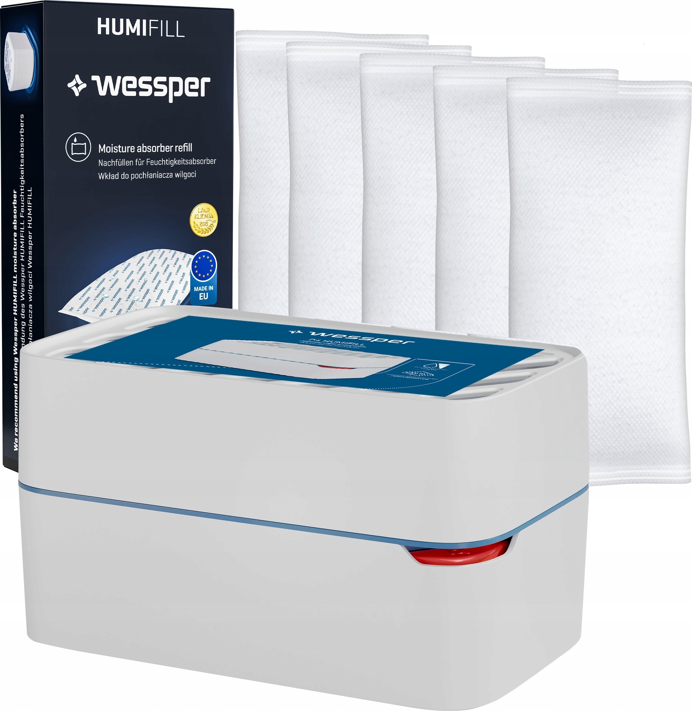 Wessper Déshumidificateur d'air Boîtier plastique Avec bouée + 5x 500G cartouche d'absorption, idéal pour voiture, grenier, garage, cave, buanderie, chambre, balance d'habitation