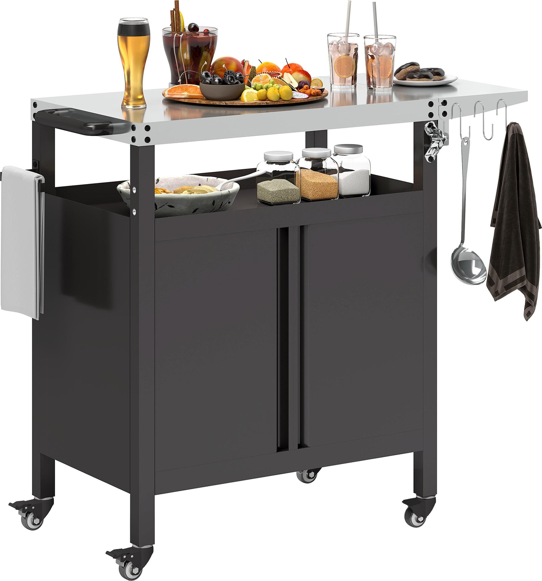 KOMFOTTEU Chariot pour Barbecue avec Armoire à Porte, Desserte de Jardin avec Porte-Serviettes et 6 Crochets, Desserte d’Extérieur, Plan de Travail en en Acier Inoxydable, 127 x 50 x 84 cm