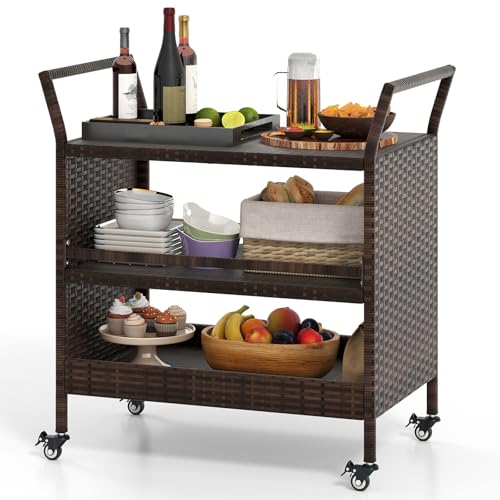 KOMFOTTEU Chariot pour Barbecue à 3 Niveaux, Desserte de Jardin en Rotin PE, Desserte d’Extérieur avec Poignées, 86 x 50 x 89 cm, pour Cuisine, Salle à Manger, Salon, Cour, Mix Marron