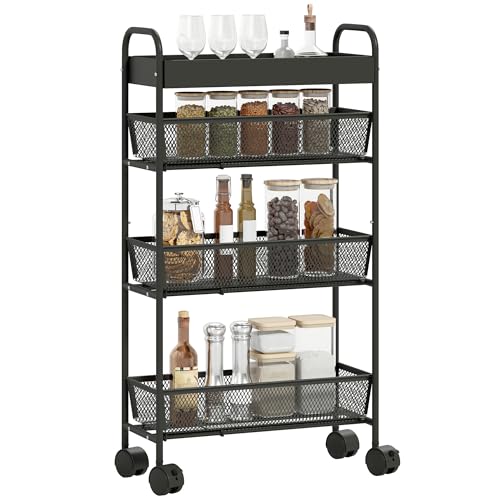 HOMCOM Chariot de rangement à 4 niveaux, 3 paniers coulissants, desserte à roulettes, panier supérieur et poignée, desserte cuisine multifonctionnel pour chambre, salon, bureau, 19 x 43,2 x 80 cm noir