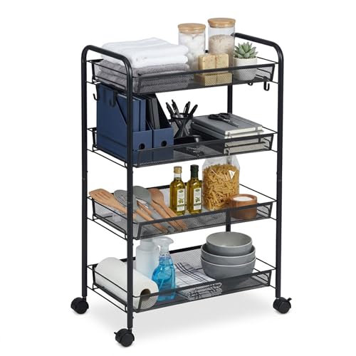 Relaxdays Chariot en Maille 4 Étagères, Desserte Cuisine/Salle de Bain/Bureau, Métal Noir, 84×44,5×26 cm