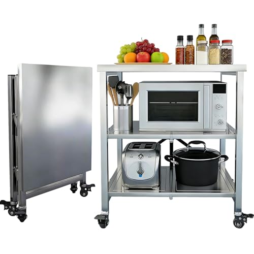 Desserte à Roulettes Pliante Pliant Chariot de Cuisine en acier inoxydable avec roues rotatives, étagère de salle de bain pour four à micro-ondes avec roues de verrouillage pour Buanderie Bureau ( Col