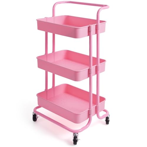 GIANTEX Chariot de Rangement à 3 Niveaux avec 3 Paniers, Chariot de Cuisine Service avec 4 Roues Universelles & 2 Freins, Desserte à roulettes pour Cuisine, Salon, Salle de Bain, 42x35x87 cm (Rose)