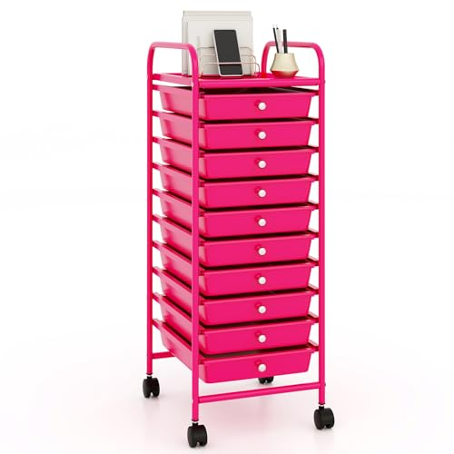 COSTWAY Chariot de Rangement à roulettes avec 10 Tiroirs Plastiques Amovibles, Tour de Rangement à roulettes, Cadre en Métal, Desserte pour Cuisine Salle de Bain École, 33x37x86cm (Rose Bonbon)