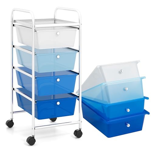 COSTWAY Chariot de Rangement à roulettes avec 4 Tiroirs Plastiques Amovibles, Tour de Rangement à roulettes, Cadre en Métal, Desserte pour Cuisine, Salle de Bain, École (32x37x76cm,Dégradé Bleu)