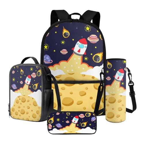 Tevecatos Lot de 4 sacs à dos pour garçons avec boîte à déjeuner, trousse à crayons et porte-bouteille d'eau, Dessin animé fusée planète galaxie, taille unique