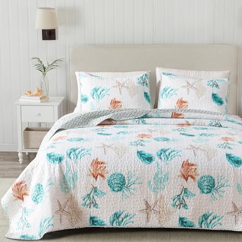 Great Bay Home Collection Key West Quilts – Couette côtière légère réversible 2 pièces avec 1 taie d'oreiller | Pour toutes les saisons, pour la plage | Ensembles de dessus-de-lit corail et coquillage
