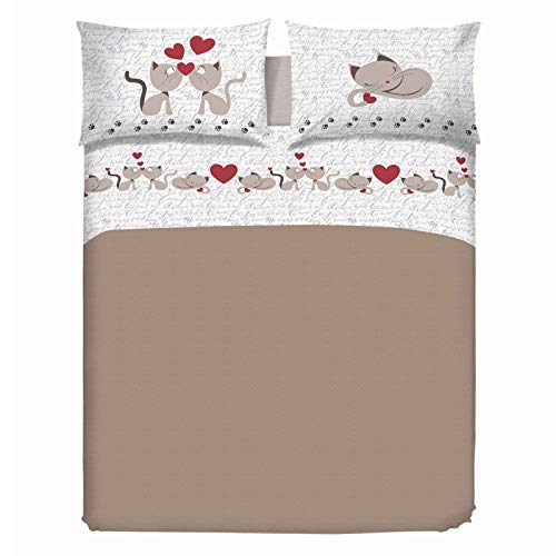 PENSIERI DELICATI Parure de lit 1 Place et demie 100% Coton, Parure de lit 1 Place et demie 120 x 200 cm, avec Drap Plat, Dessus et 1 taie d'oreiller, fabriquée en Italie, Fantaisie Chatons Beige
