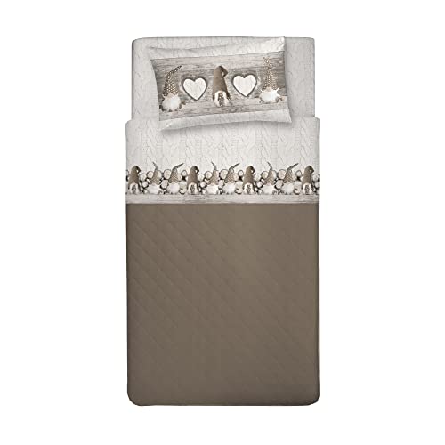 PENSIERI DELICATI Parure de lit 1 Place et demie 100% Coton, Parure de lit 1 Place et demie 120 x 200 cm, avec Drap Plat, Dessus et 1 taie d'oreiller, fabriquée en Italie, Motif GNOME Beige