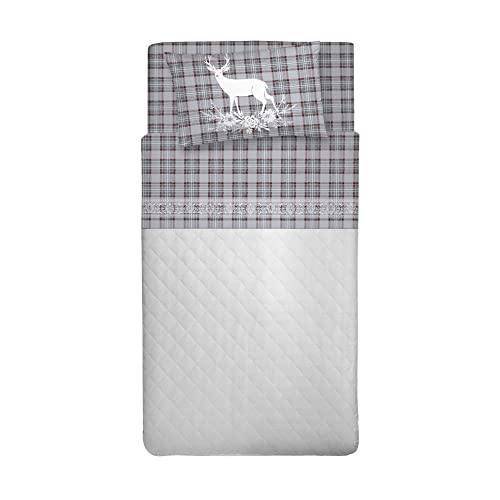 PENSIERI DELICATI Parure de lit Simple 100% Coton, Parure de lit Simple 90 x 200 cm, avec Drap Plat, Drap Dessus et 1 taie d'oreiller, fabriquée en Italie, Motif Tartan cerf Gris