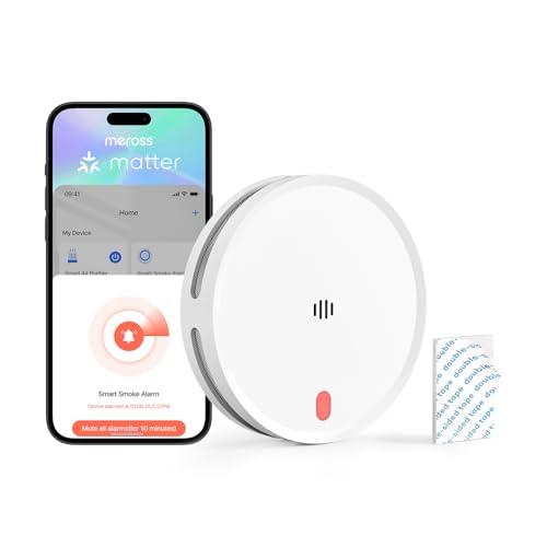 Meross Matter Détecteur de Fumée Connecté, Alarme Incendie Intelligente Wi-FI avec Double capteur Optique, Détecteur Fumée avec Alerte APP, Maillage 0,8 mm, 33 mm, avec Hub MSH450, 1 Pièce