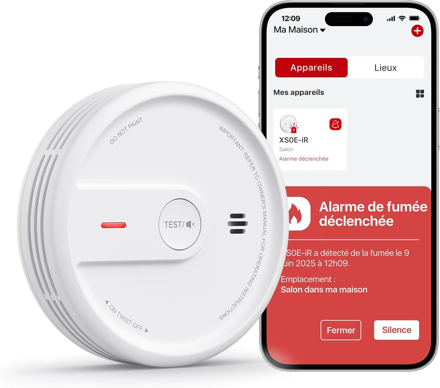 JEXNOVASHOP-Détecteur de Fumée Connecté Wi-FI, Alarme Incendie avec Alertes Vocales en Français, 17 Emplacements, Batterie Remplaçable, Épaisseur 33 mm, XS0B-iR, Lot de 1